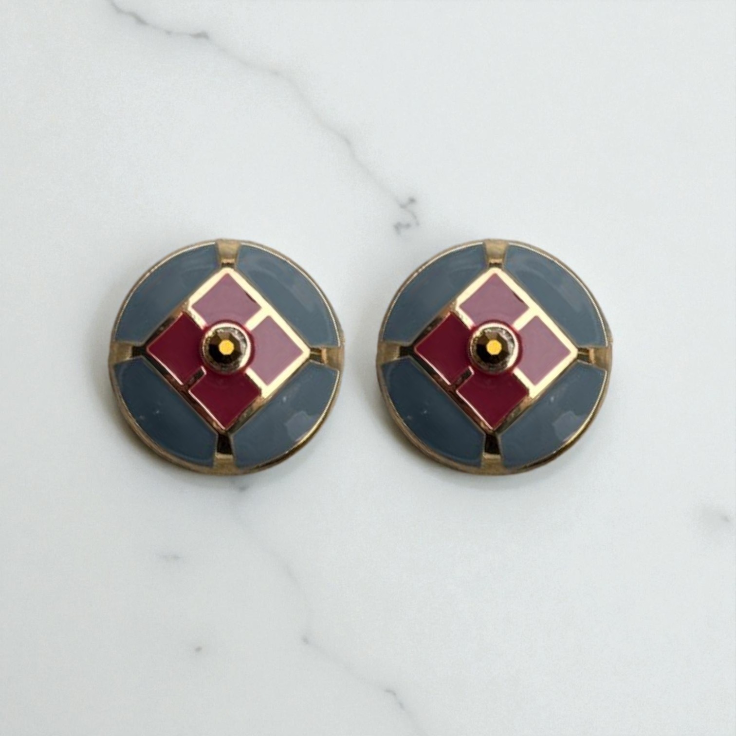 Lignes dorées, éclats d’émail et reflets profonds : le bijou de bouton Arty Bleu Grenat capture l’esprit vibrant de l’Art Déco. Son motif géométrique, souligné d’un quadrillage doré, compose une mosaïque d’élégance où se mêlent bleu-gris velouté et grenat intense.