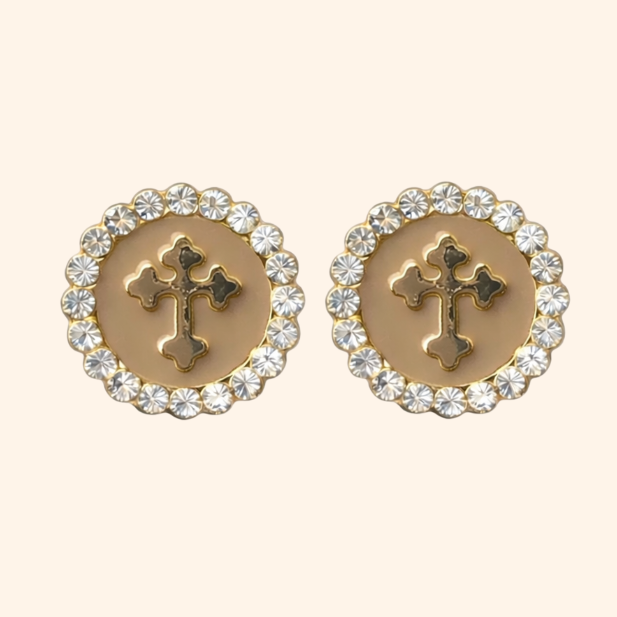 L’émail lisse capte la lumière avec douceur et met en valeur la croix centrale, soulignée par un entourage de strass discrets. Le métal doré structure l’ensemble pour un rendu harmonieux, graphique et parfaitement équilibré.