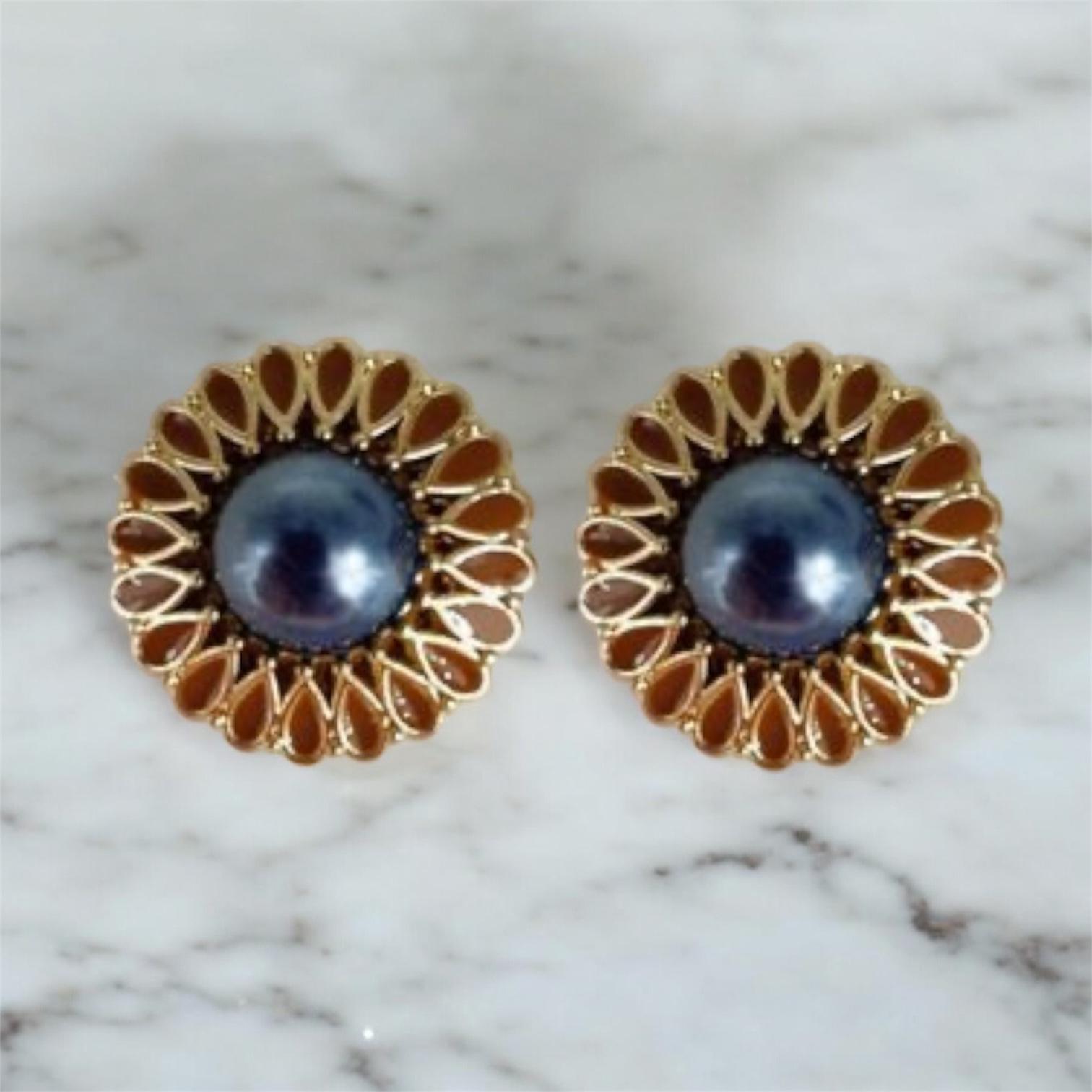 Au cœur du bijou, une perle nacrée bleu nuit révèle des reflets profonds, presque veloutés, qui accrochent la lumière avec retenue. Autour d’elle, un motif floral ajouré en métal doré patiné se déploie en pétales délicatement émaillés d’une teinte ambrée chaude. L’ensemble compose un jeu de clair-obscur raffiné, à la fois doux et affirmé.