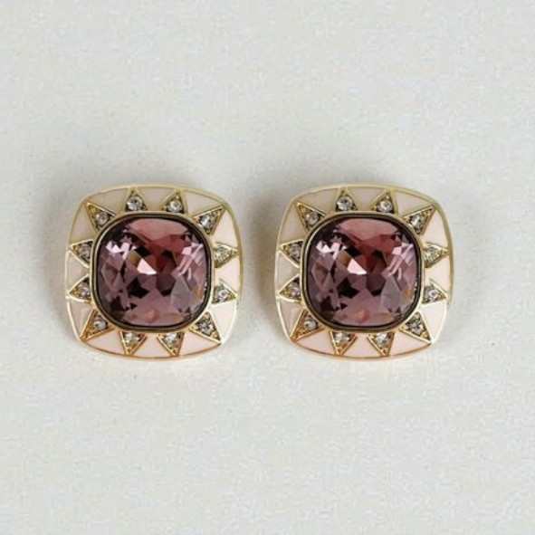 Au centre du bijou, une pierre rose inspiration morganite, taillée en forme carrée et finement facettée, capte la lumière avec douceur. Sa teinte rosée légèrement poudrée évoque la délicatesse minérale de la morganite, offrant un éclat feutré, subtil et élégant. Autour de cette pierre centrale, un motif rayonnant serti de strass dessine une couronne graphique qui structure le bijou et renforce son caractère joaillier.