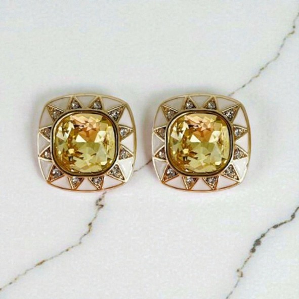 Au centre de ce bijou de bouton, une pierre couleur citrine, taillée en forme carrée et finement facettée, capte la lumière avec intensité. Sa teinte chaude et lumineuse évoque la chaleur d’un soleil doré, apportant éclat et relief à la tenue. Autour de la pierre centrale, un motif de rayons solaires sertis de strass dessine une couronne lumineuse, renforçant l’effet précieux et la sophistication du design.