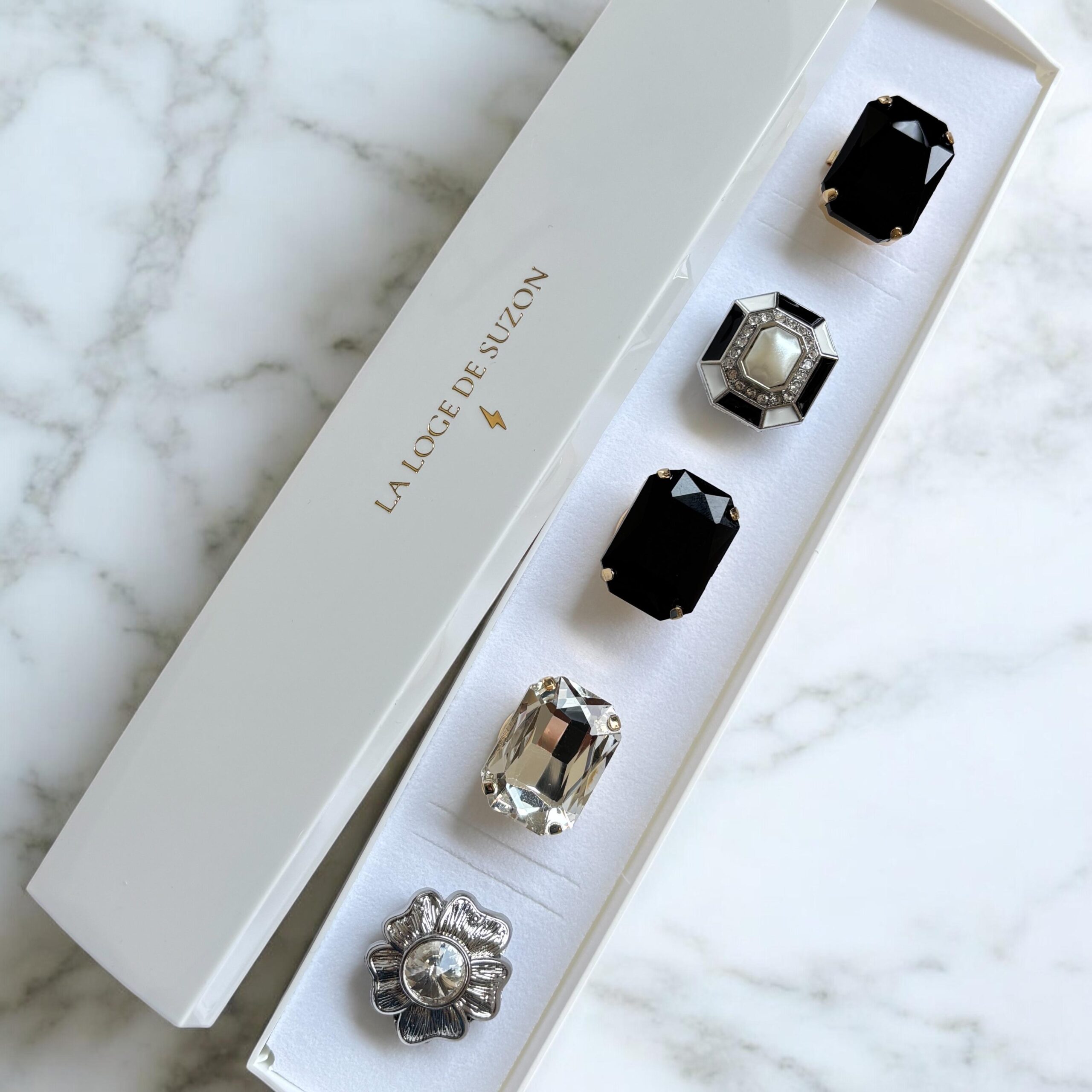 Cette boutonnière unique réunit 5 bijoux de bouton exclusifs, créés avec passion par Suzon.
